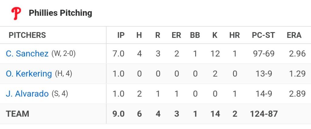 The story of the Phil’s win was their 6’6″, lefty starter Christopher Sanchez, who struck out 12 Giants, giving up only the two runs to Matt Chapman.