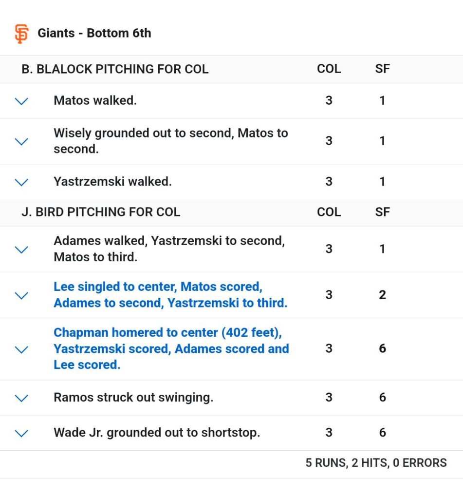 Luis Matos, in at DH to give Wilmer Flores a rest, gave the Giants the lead with a solo shot in the 3rd. Hicks held the Rockies scoreless for five then opened the 6th with a lead off walk and two singles.