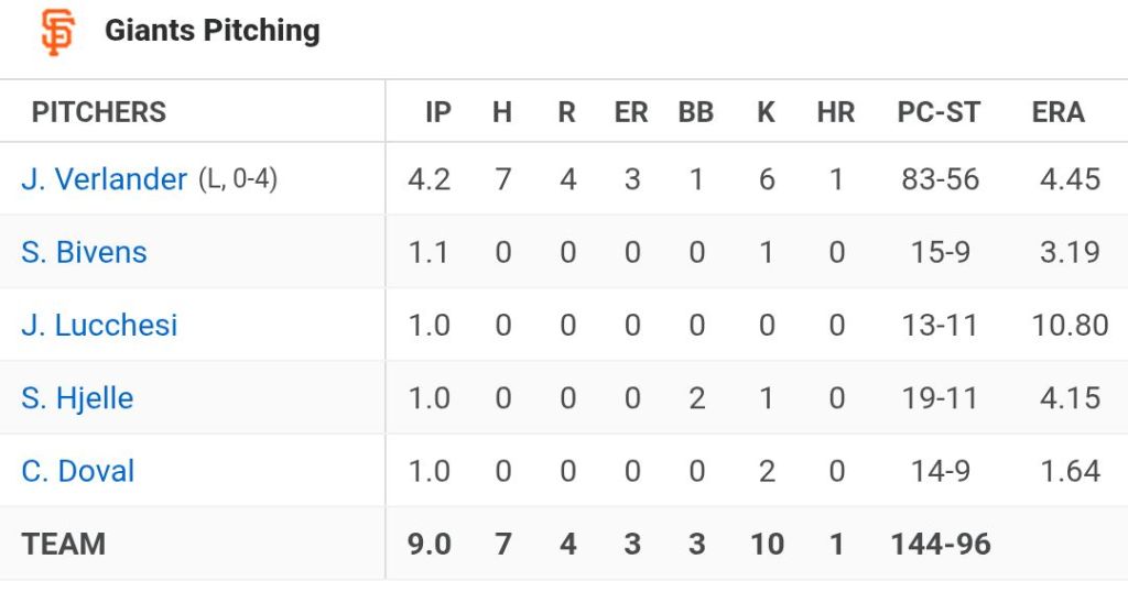Devers was 2-for-5 and ripped an RBI double in his first game as a Giant, but the Giants lost 3 – 2. Tonight Devers was hitless in three ABs and the Giants lost 4 – 2.